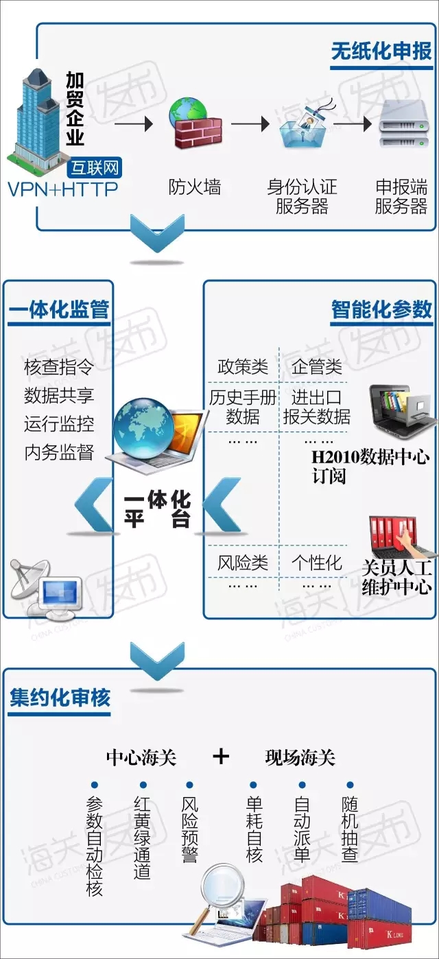 通過內(nèi)部的流程再造,以信息化手段實現(xiàn)加工貿(mào)易海關(guān)執(zhí)法作業(yè)的無紙化,以集中管理、專業(yè)審核實現(xiàn)集約化,以完善風險參數(shù)實現(xiàn)運行監(jiān)控的智能化,通過信息互聯(lián)互通,相關(guān)部門廣泛參與、錯位監(jiān)管、協(xié)同施力,最終實現(xiàn)加工貿(mào)易監(jiān)管的一體化。